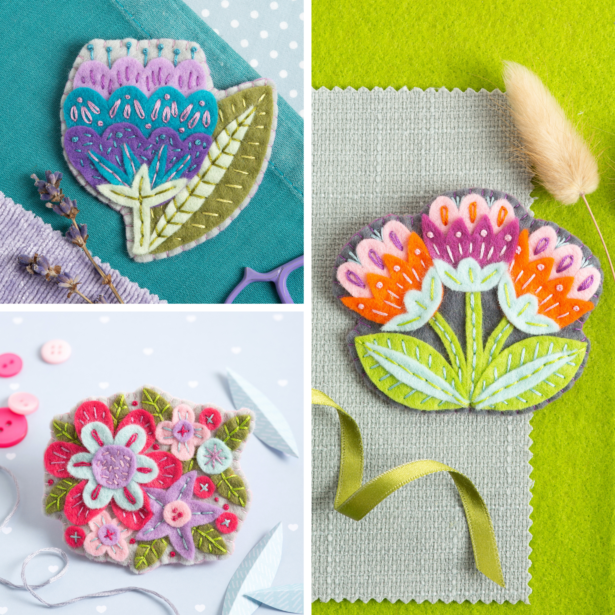 Welcome to the wonderful world of felt crafts! These wool felt flower brooches are a great way to get creative and make your own unique hand-crafted piece of art. Each kit comes with everything you need to make your very own unique hand-stitched flower brooch, and this bundle brings you 3 of our best-selling designs.