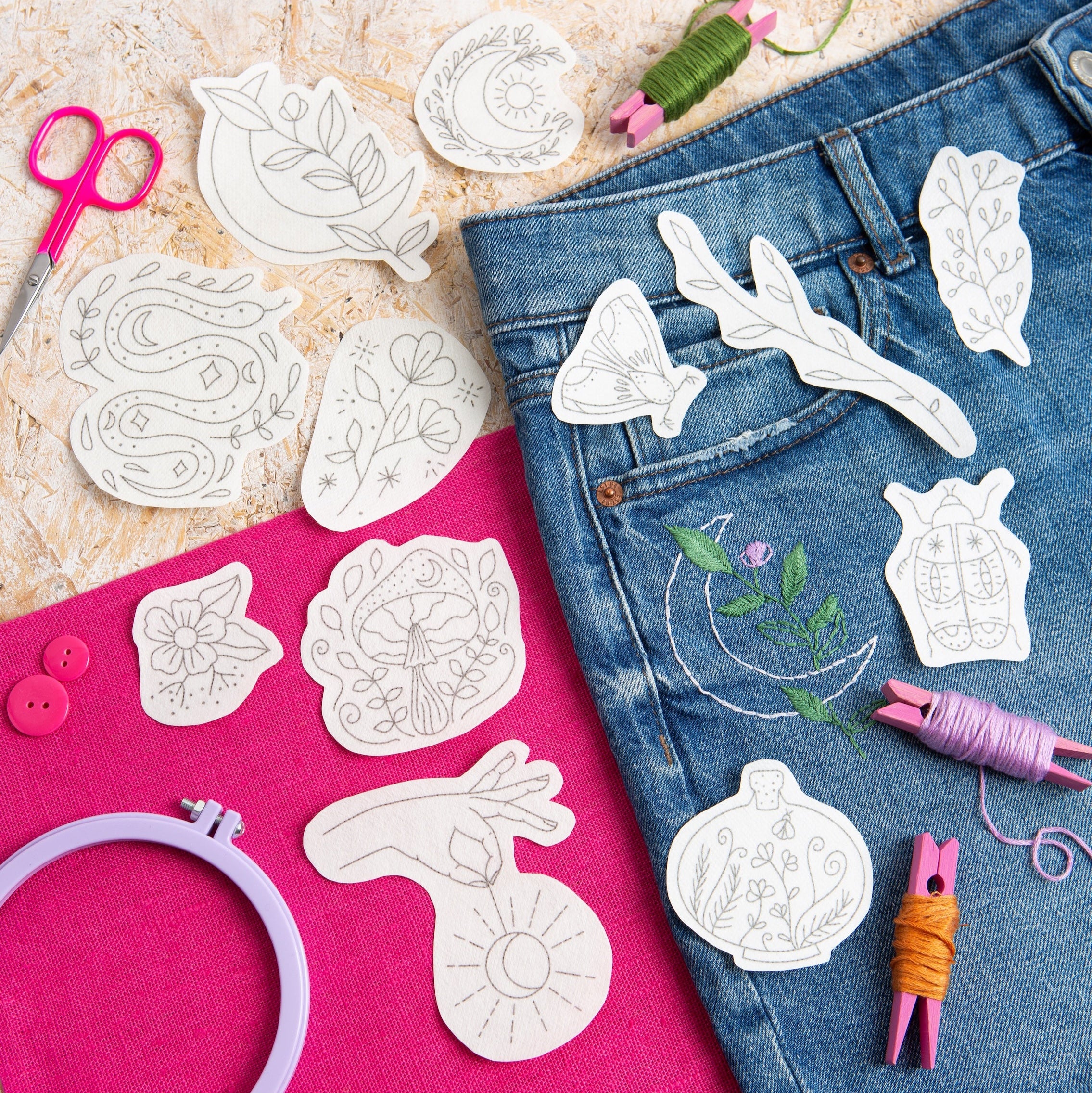 Celebrate your love for all things folky with this beautiful set of folk inspired animal and plant themed designs, perfect for personalising your clothes, bags, and accessories. Simply cut out your chosen motif, stick it in place, stitch over the design, then rinse away the backing to reveal your unique embroidered creation.