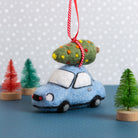 Create a scene straight from a holiday greeting card with a classic car carrying a Christmas tree, all crafted with love by you.