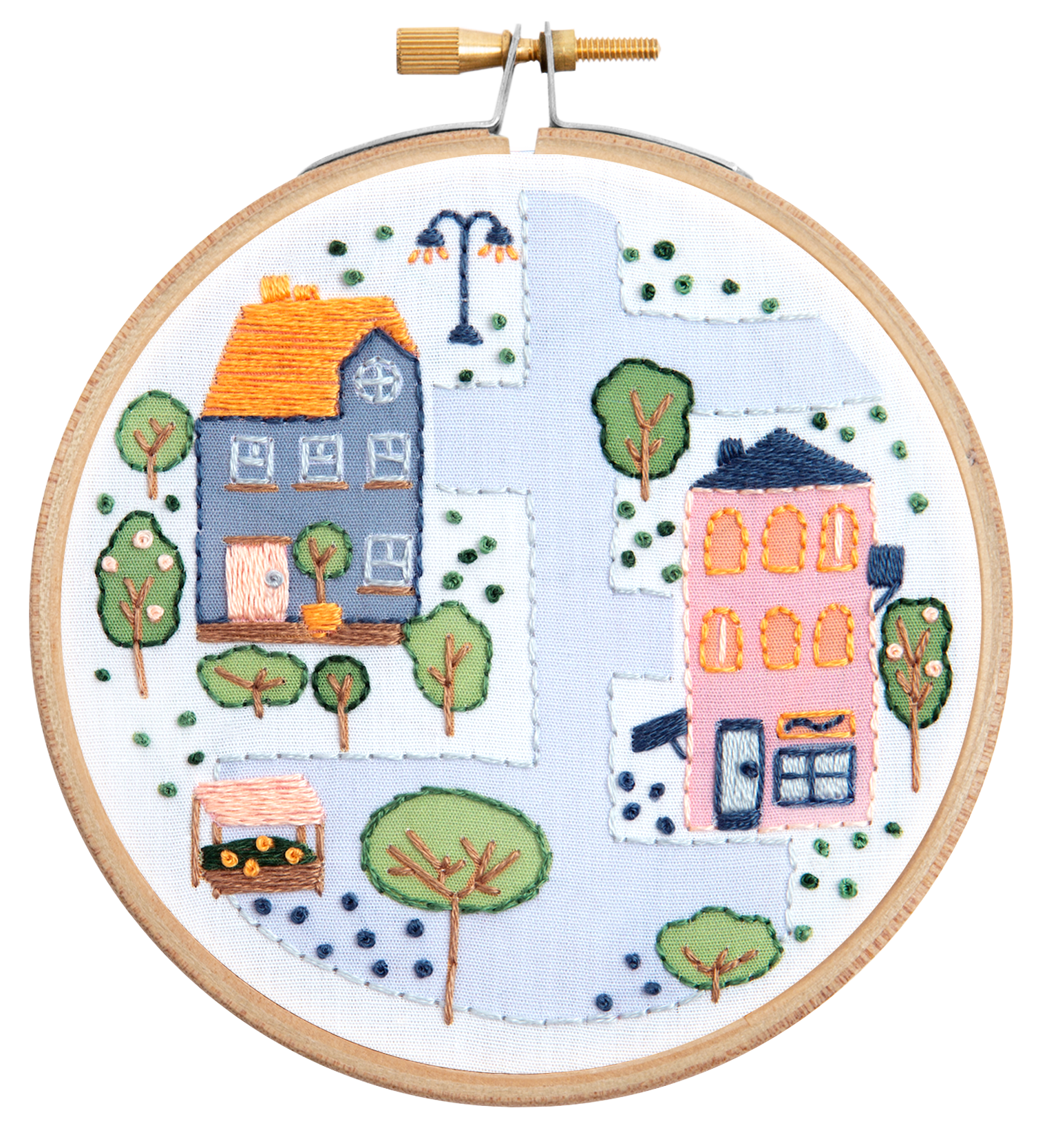 The 48-page instruction booklet and pattern guide will hold your hand every step of the way, so even a total newbie can create their very own piece of hoop art. The pattern is pre-printed on the fabric and the kit comes with all the necessary materials so all you need is your creativity and pair of scissors. So, grab your coffee, sit back and let's get stitching! Imagine creating your own little town where you can be the architect and decorator of these cute townhouses.